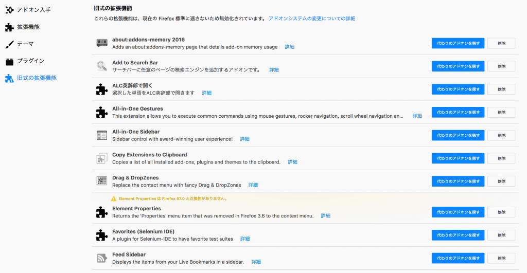 Tab Mix PlusもFireGesturesも、Make LinkもAll-in-One Sidebarも、そしてFeed Sidebarも旧式の拡張機能という忌まわしい名のカテゴライズをされて、機能を停止していました。